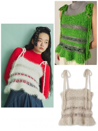 透かし編みで抜け感を出して、フリンジニットの主張の強さを中和。肩紐は結び具合で丈感を調整できる長めのリボンタイプ。