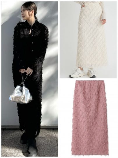 フリンジで格子柄を表現して、もけもけにシャープさをプラス。素材のボリュームをIラインフォルムで引き締めました。