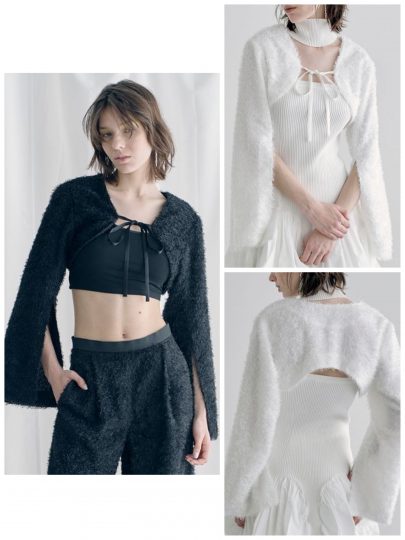 短い着丈が重心を上げて、脚長に見せてくれるボレロタイプのジャケット。素材感と胸元のリボンがモードな甘さを演出。