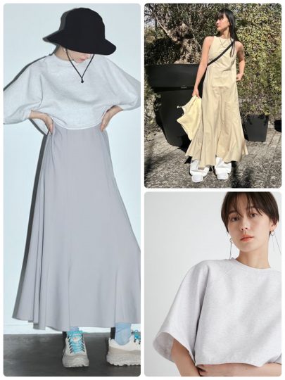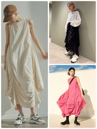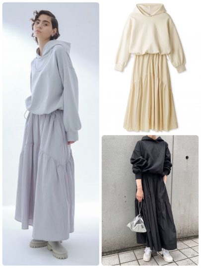 軽い着用感のフーディーパーカーとハリのあるギャザースカートをドッキング。カジュアルな組み合わせでも、シンプルなワンカラーでまとめたことで幼く見えません。ドロスト仕様のウエストなのでブラウジングしたり、ストンと落としても着用可能。