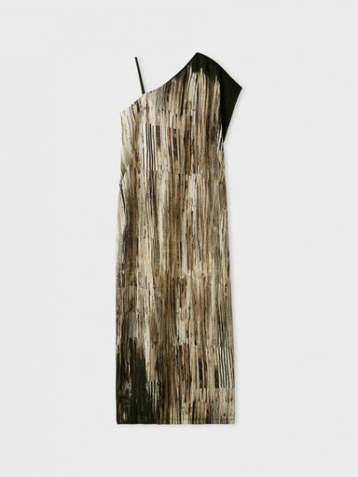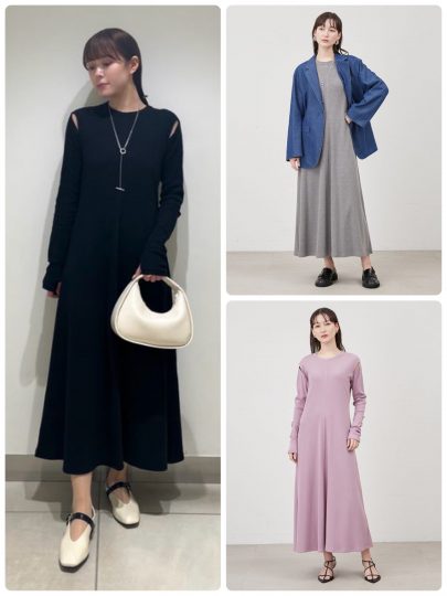 控えめなフレアシルエットが上品なワンピース。アームホールにスリットを施すことで、抜け感も加算しました。