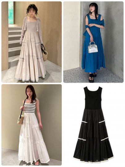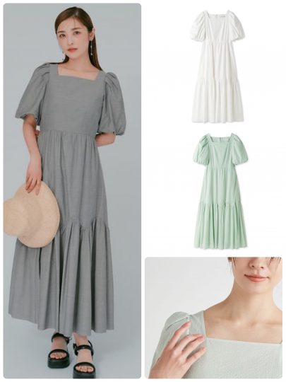 異素材のMIXで異なる質感を楽しめるコンビティアードワンピース。ふわんり広がるボリュームスカートなので、上半身は深めのスクエアネックでメリハリを。シティからリゾートまで幅広いシーンで活躍しそう。