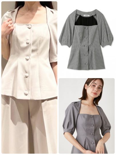 トレンドを感じるぺプラムにデコルテを綺麗に演出するスクエアネックで、シャープで洗練された雰囲気に。同素材のパンツとセットアップで着ればハンサムレディなスタイルが完成します。