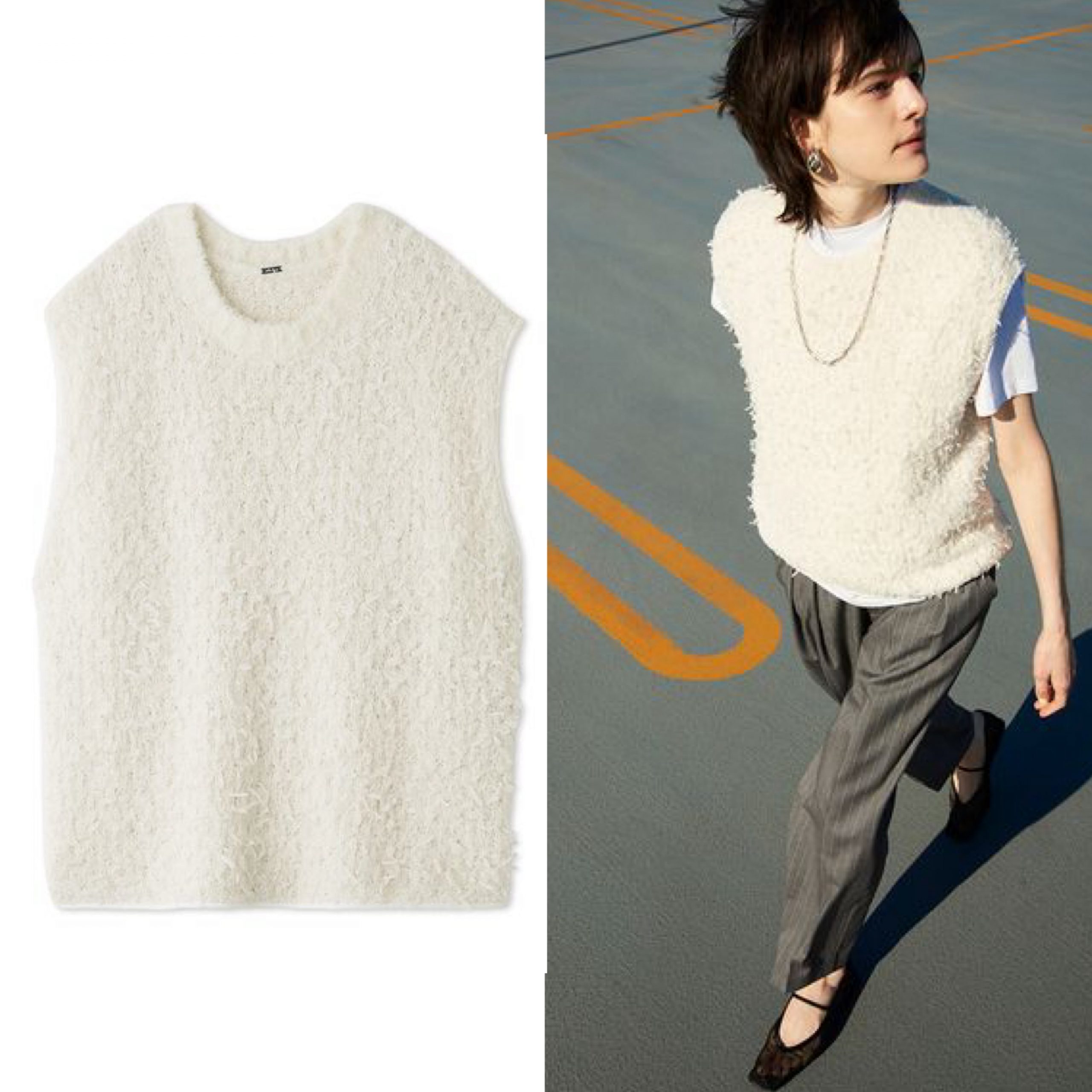 中にシャツを入れたレイヤードも単品も可愛く着回せるノースリシャギーニット。1枚あるだけでいつものコーデが存在感のある着こなしに。