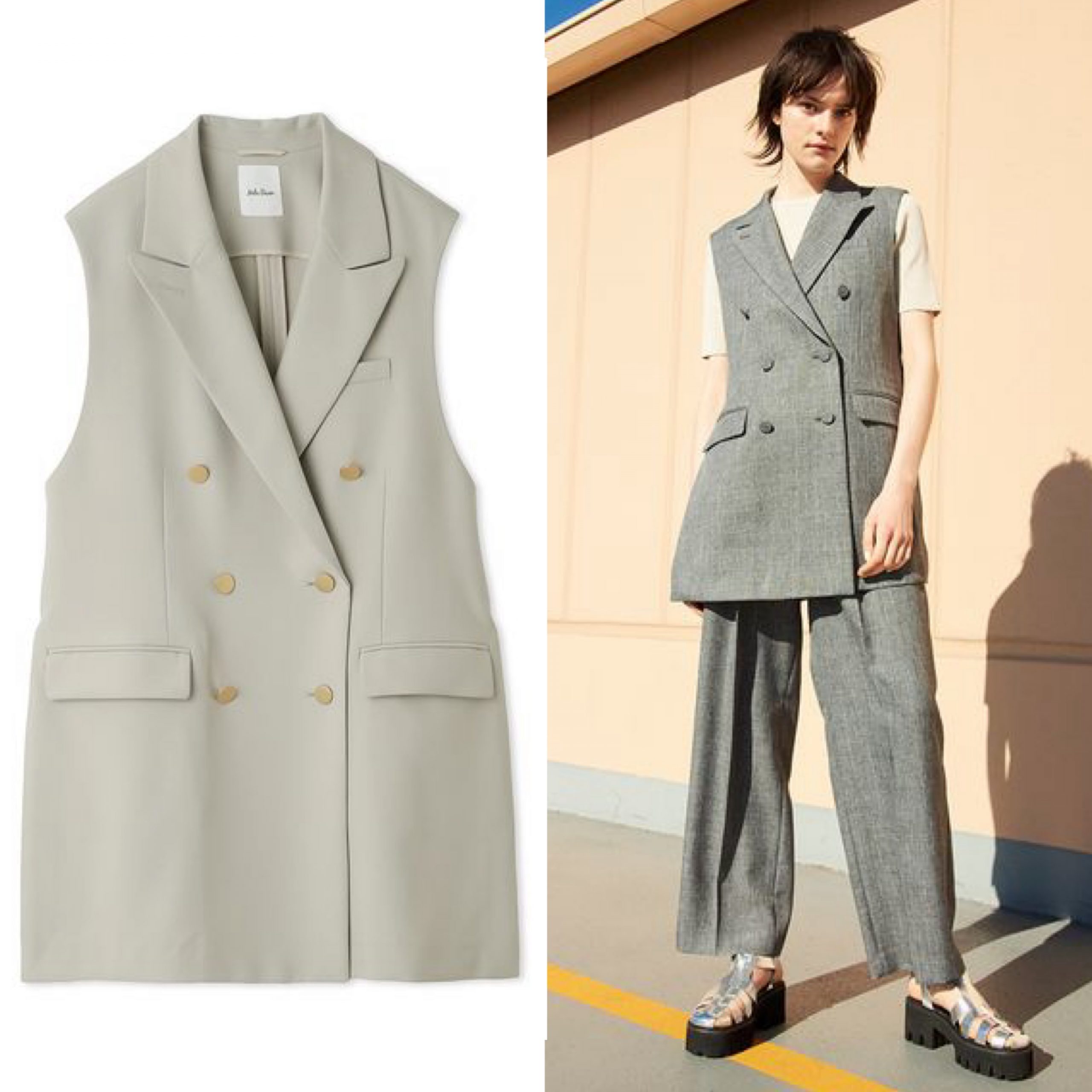 真夏の通勤に重宝する、綺麗めジレ。同素材のパンツもあるので、セットアップとしても着られます。マニッシュなダブルブレストデザインなので、オケージョンにも。