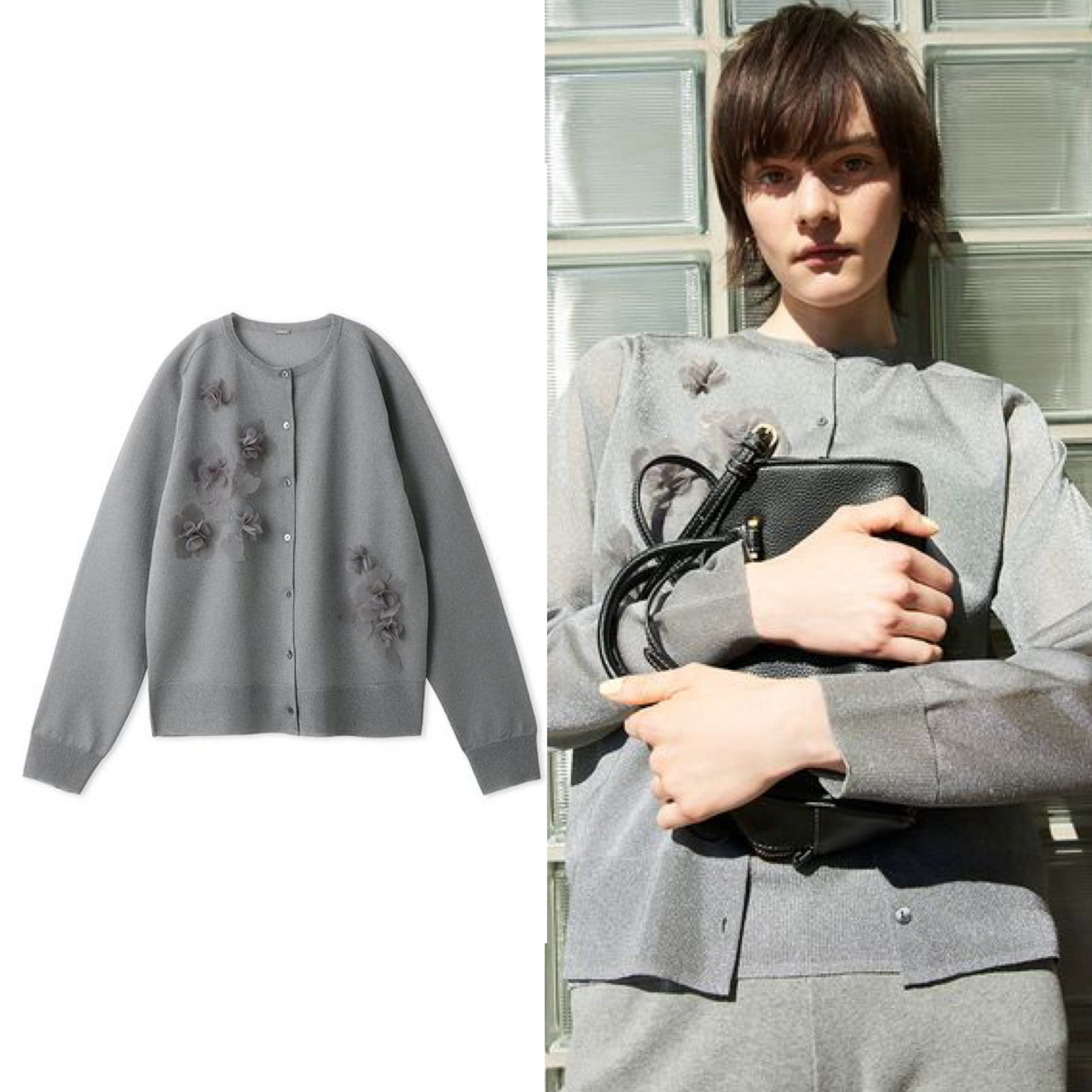 定番の丸首アンサンブルのカーディガンが、今季は同色のアップリケがついて登場。生地もキラキラが入ってとっても華やか。お家で洗えるのも嬉しいし、肌触りがさらりとしていてとても気持ちいいんです。