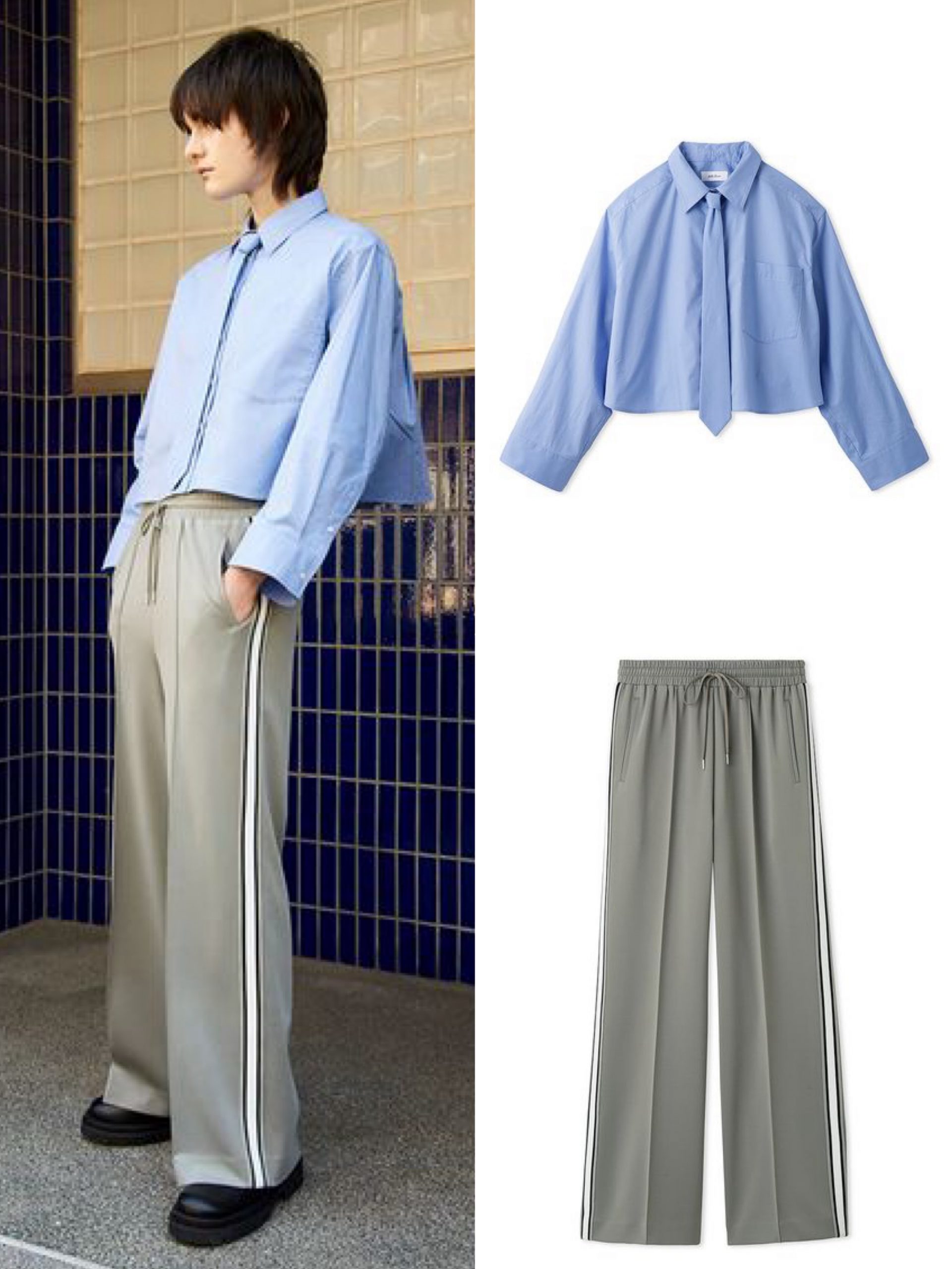 コーデ買いしたくなる、サイドラインが印象的なジャージパンツと、短丈シャツ。シャツに付いているネクタイは取り外し可能です。