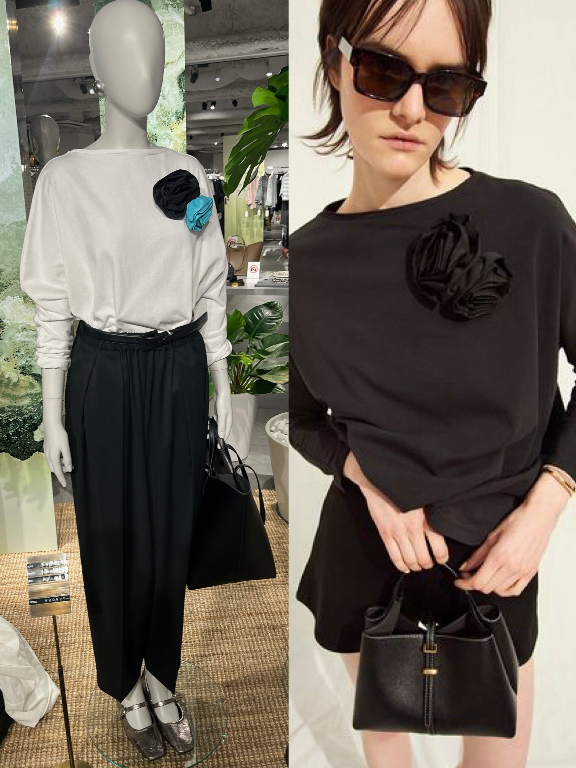 大きなコサージュが胸元に付いた、ドルマントップス。コサージュを取り外すと、ミラらしいこなれたシルエットのカットソーになるので、カジュアルな日にも着回せます。上品なボートネックなのもポイント。