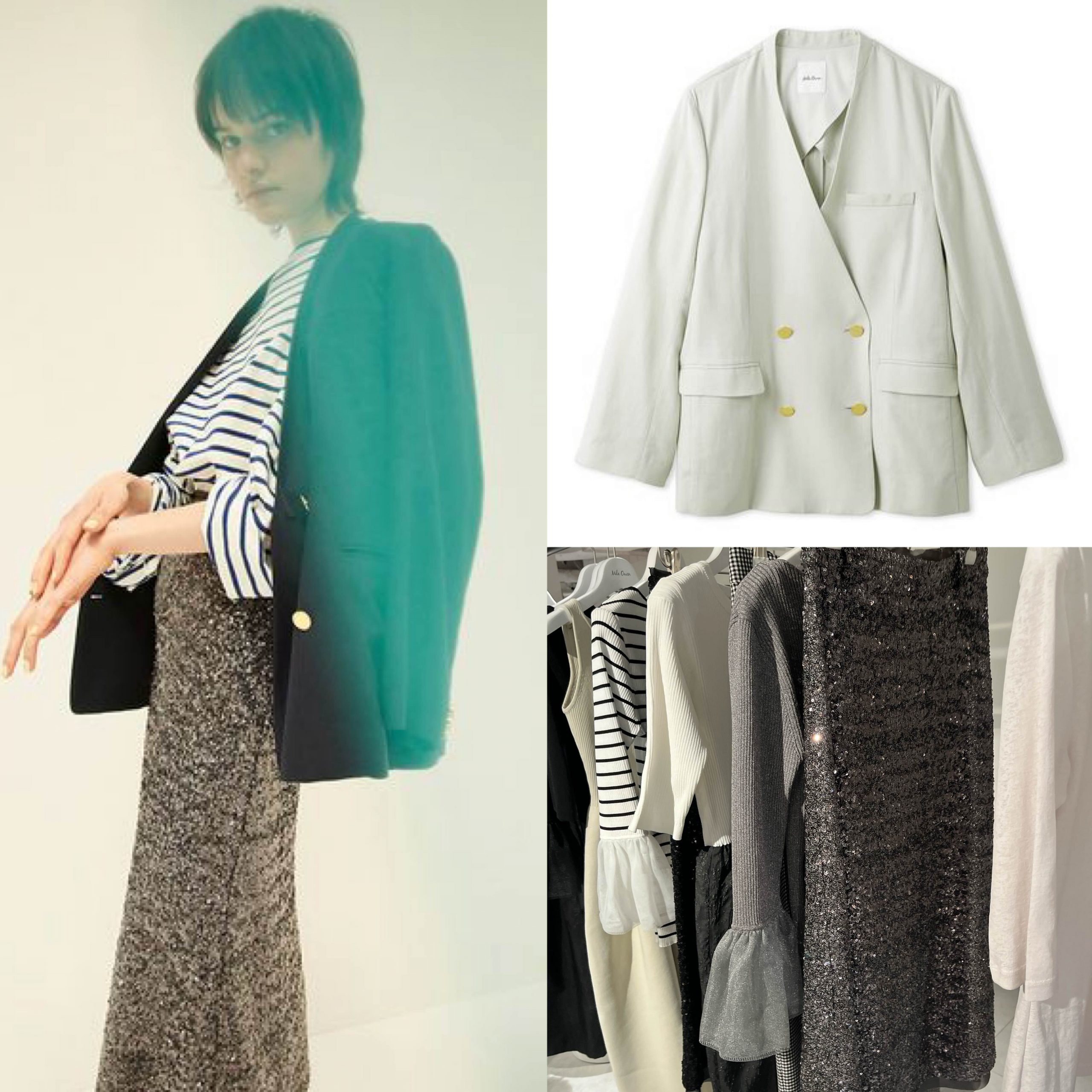 ノーカラージャケットにキラキラのスパンコールスカートを合わせた華やかなルック。いつものコーデがパッと洗練されます。涼しい素材の夏用ジャケットも、サイズがあるうちに買い揃えておきたい。