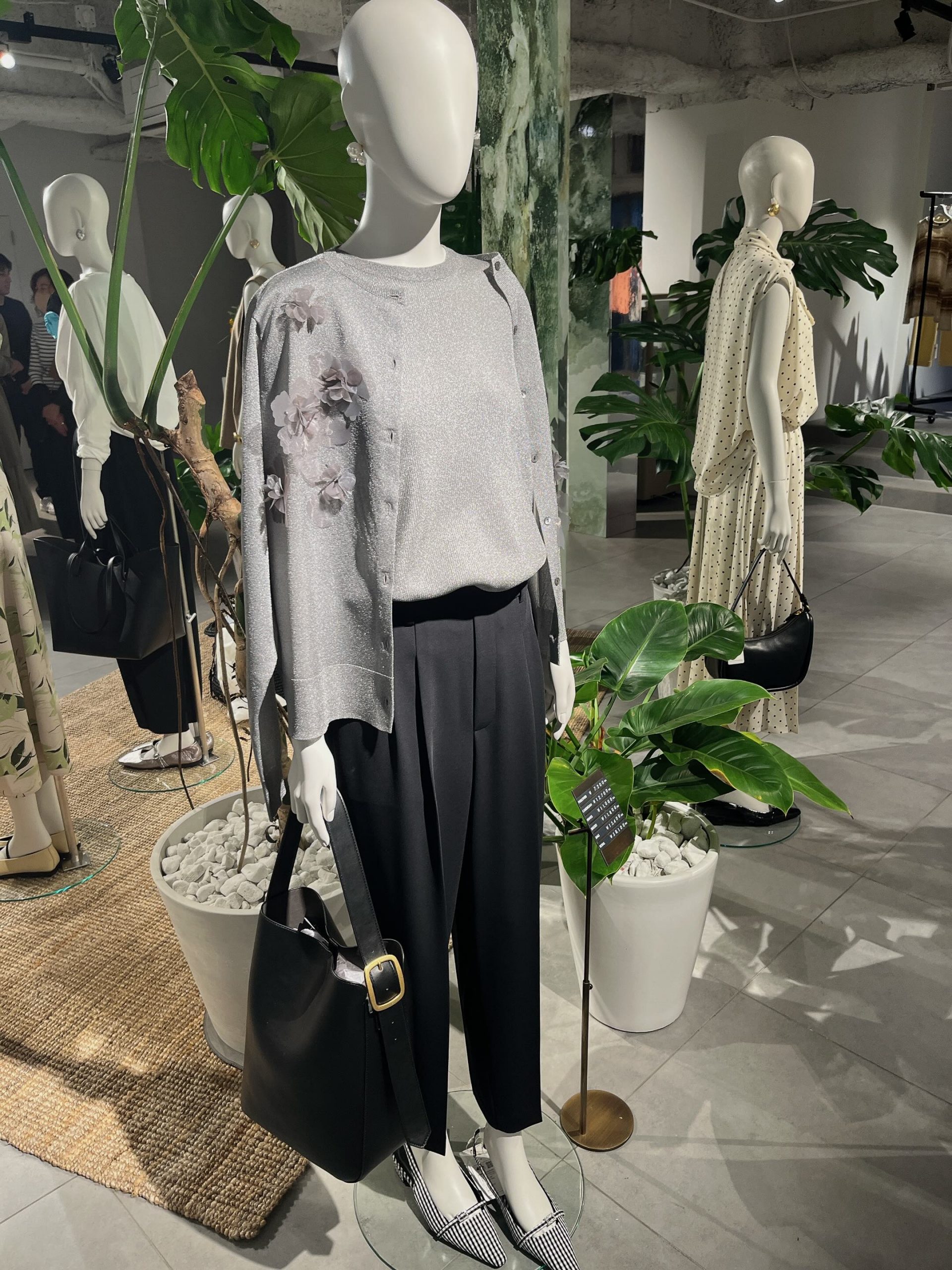 定番の丸首アンサンブルのカーディガンが、今季は同色のアップリケがついて登場。生地もキラキラが入ってとっても華やか。お家で洗えるのも嬉しいし、肌触りがさらりとしていてとても気持ちいいんです。
