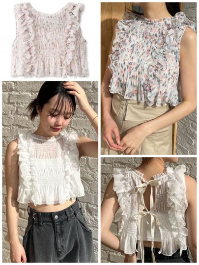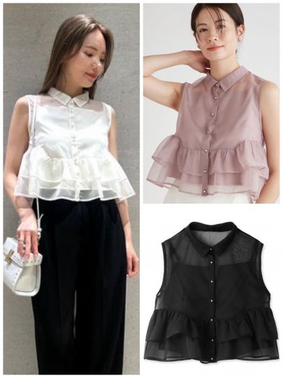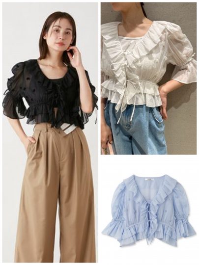 2段フリルが揺れる甘めブラウスも、襟付きタイプならきちんと感アリ。マットな質感のオーガンジーで、シアー素材ながらあくまでエレガントさはキープできます。