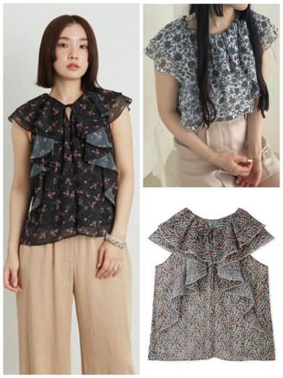 流れるようなラッフル使いでコーデに動きをプラスしてくれるブラウス。カラーによって雰囲気が異なるボタニカル柄がノスタルジックで可愛い。