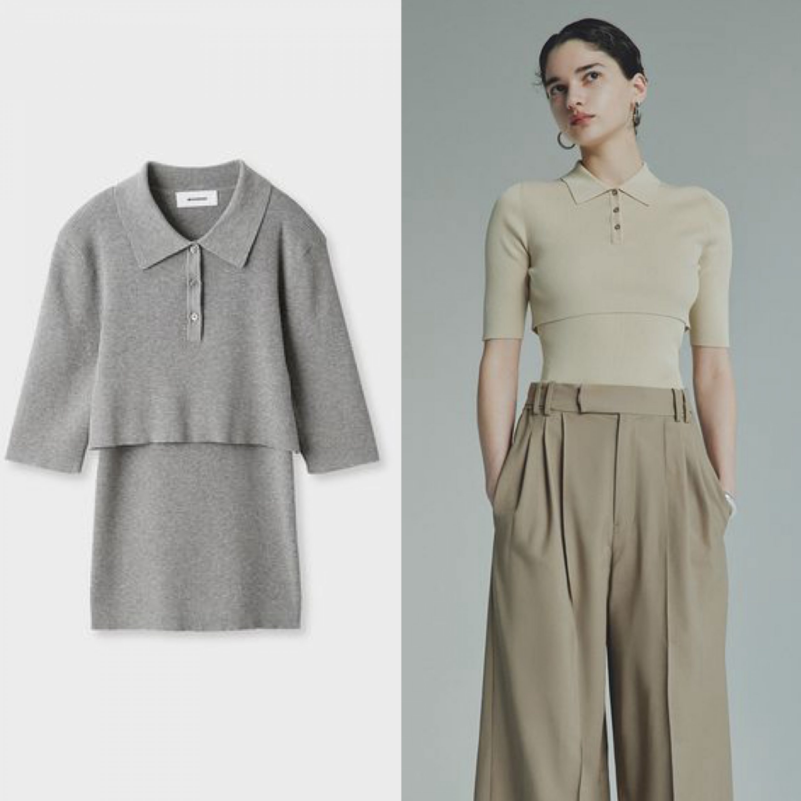 もうちょっと人と差がつく、パンチのあるデザインポロを探している人はこちら。めちゃくちゃ短い短丈ポロシャツとベアをレイヤードしたデザイン。インナーは単品としても使えるベアトップになっています。レイヤード半袖リブニット/ミースロエ
