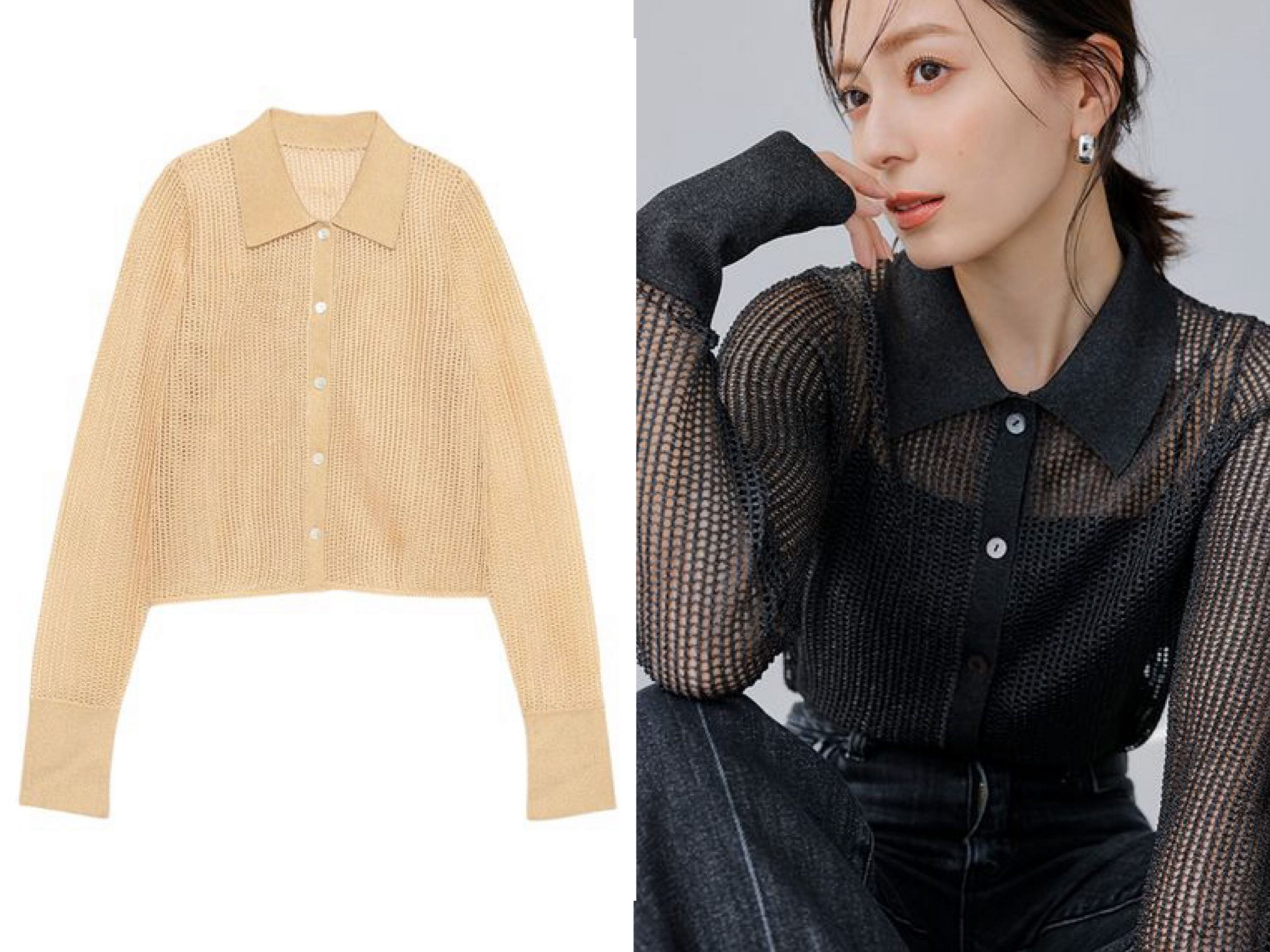 アニュアンスのポロは、メッシュ素材でさらに女っぽさアップして登場。こちらもラメがキラキラ光る仕様になっています。短丈なのでINもしやすい。ラメメッシュニットポロシャツ/アニュアンス