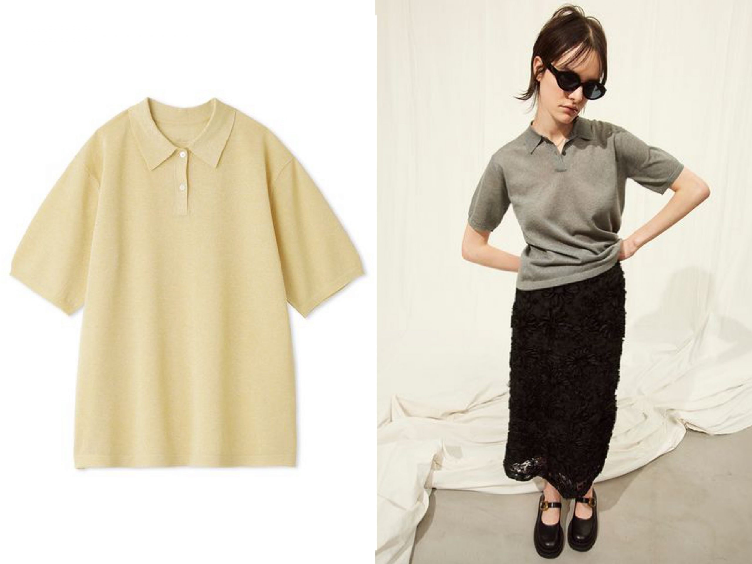 こちらはラメが入ったほんのり透けるシアー素材で作られた、ミラオーウェンらしいミニマムなポロシャツ。少しシャリ感のある素材なので、真夏にも爽やかに着られます。ポロ衿ラメシアーニット/ミラオーウェン