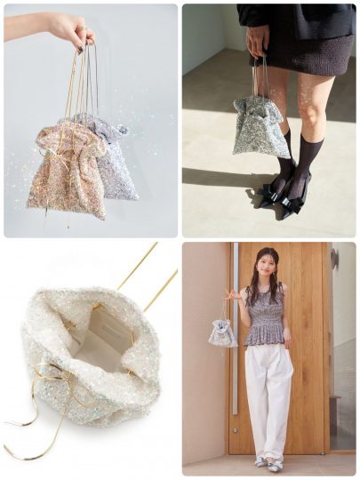 スパンコールの巾着バッグは持つだけでキマるトレンドアイテム(リボンとチェーンは取り外し可能)。シンプルなカジュアルコーデにもパーティーシーンにも合うので1つあれば重宝。