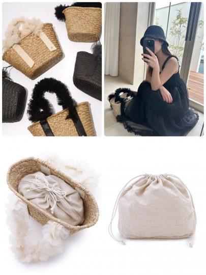 ハンドルのチュールフリルが文句なしの可愛さ♡ 上部を紐で結んで閉じられる巾着型のインナーポーチ付きです。旅行やレジャーシーンにもピッタリ、サイズは縦22×横23×マチ12.5㎝でたっぷり収納可能。