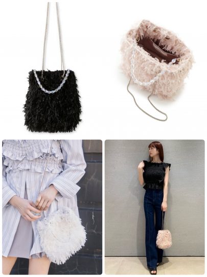 フェザー素材のチェーンバッグは縦18×横16×マチ9㎝サイズ。キラッと光るハンドルは取り外しができます!