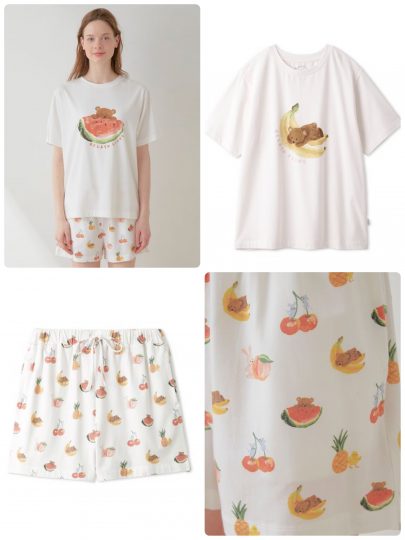 Tシャツの「オフホワイト」はスイカをかじるクマ、「ピンク」はバナナの上に寝そべったクマがポイント♡