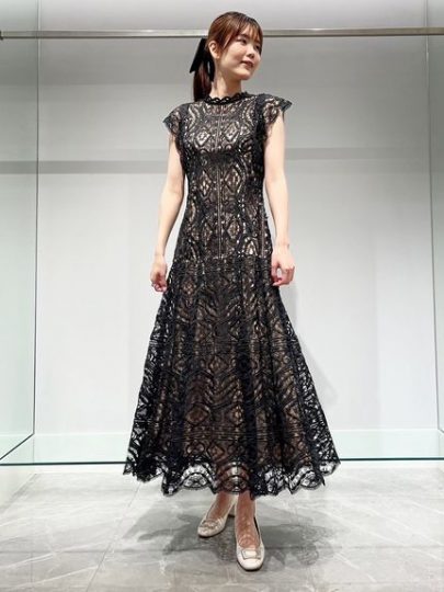 幾何学柄レースを全面に配したドラマティックなワンピース
