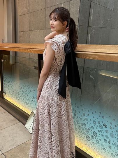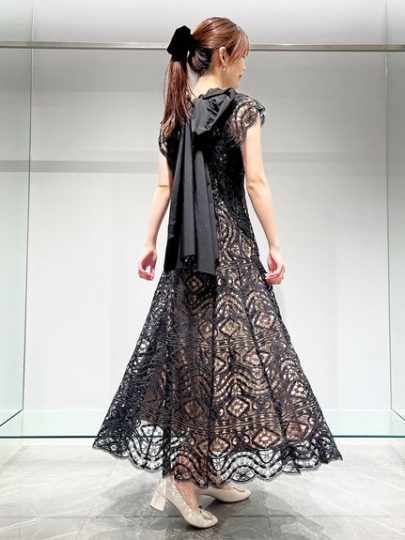 襟ぐりのデザインレースにビッグリボンを繋ぎ、バックスタイルも印象的に。背中を飾るリボンが優雅な雰囲気を演出します。そしてゆるやかなフレアスカートも上品さを後押し。