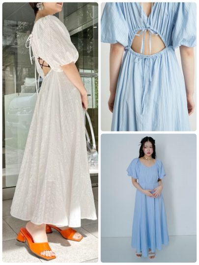 ややゆったりしたシルエットとぽわんと膨らんだ袖がフェミニン。背中側には肌見せを採用し、抜け感も演出しました。こちらは華奢なリボンを絞ることで肌見せの割合が調整できる仕様に。サンダルはもちろん、スニーカーを合わせてカジュアルダウンさせてもかわいいです。