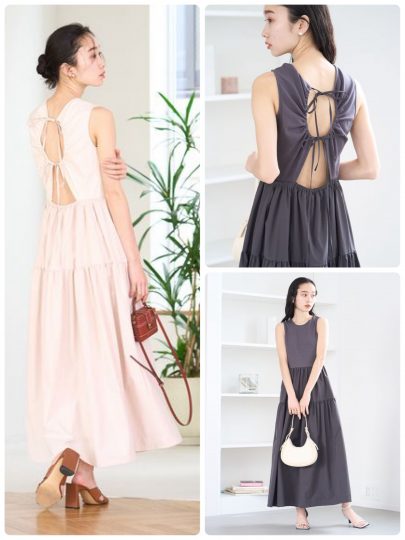セクシーなバックオープンデザインですが、ラフな雰囲気の漂う生地でやりすぎない色気が手に入ります。ストンとしたストレートシルエットでスタイルアップ効果も期待できそう。