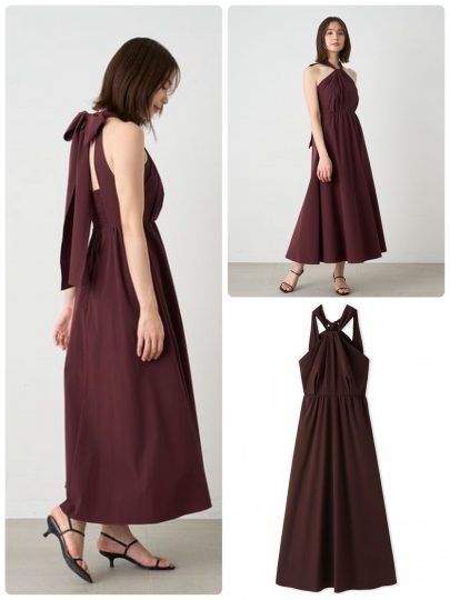 トレンドのホルターネックワンピースが新登場。首元に長めのリボンを巻き付ける仕様で後ろから見てもパーフェクトなかわいさを誇ります。甘さ控えめなマットな素材感もキモ。