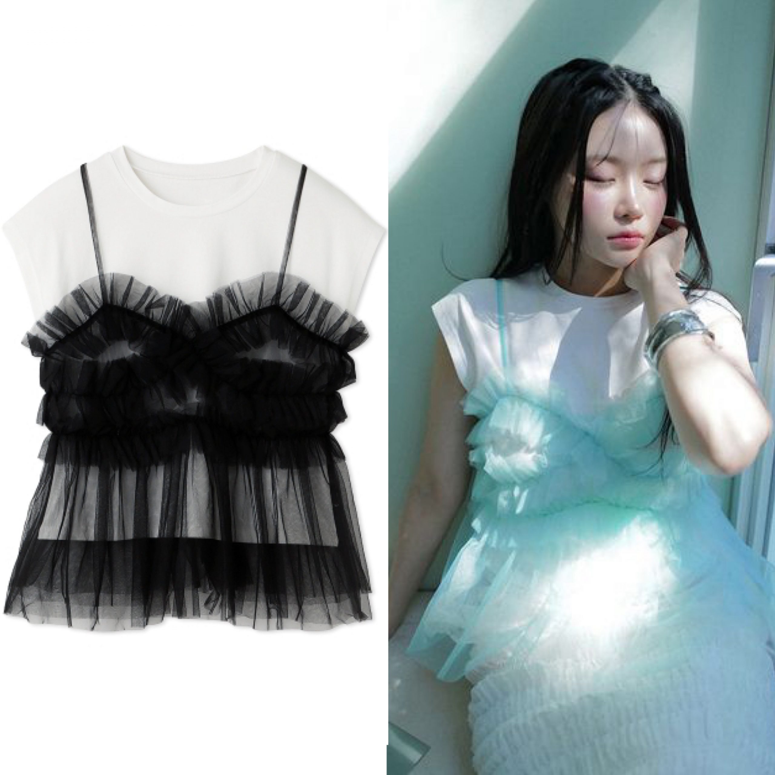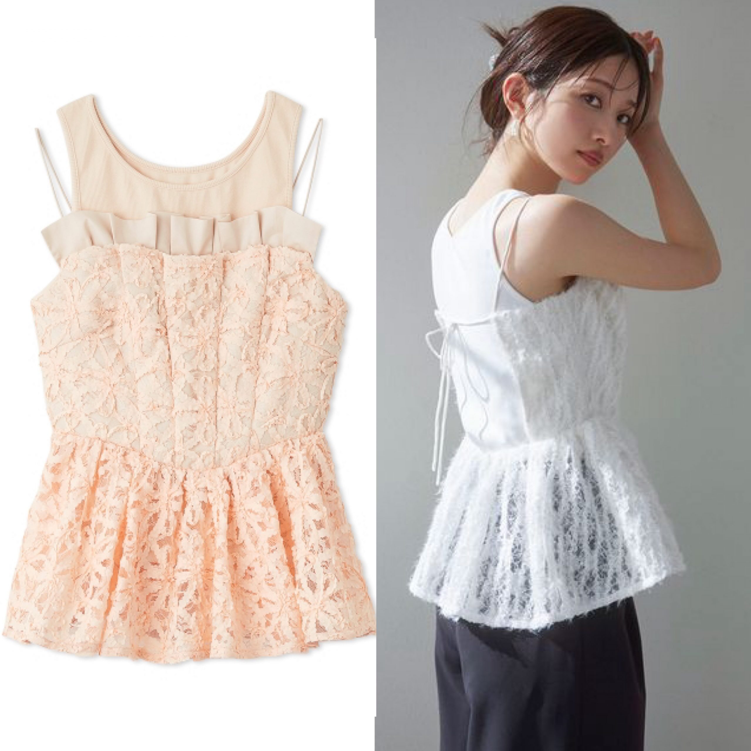 こちらのTシャツとビスチェのセットもリリーブラウンのもの。リリーブラウンはランジェリーも展開しているためか、今季流行りのセンシュアルなビスチェや短丈キャミソールなどのアイテムが豊富で可愛い。ふわふわのチュールビスチェは単体で手持ちのタンクトップやキャミに合わせても可愛い。ペプラムチュールビスチェセットTシャツ/リリーブラウン