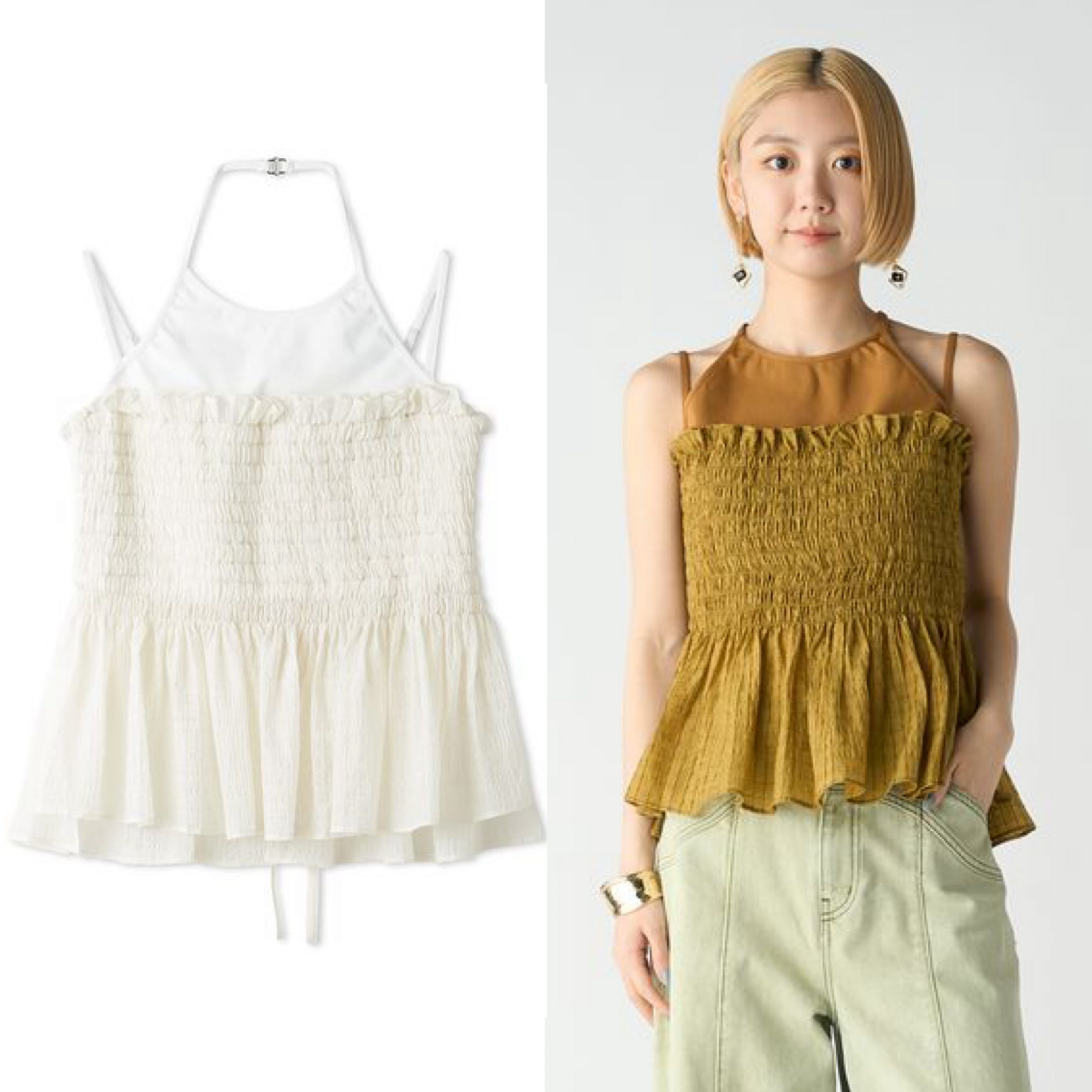 こちらはシャーリングキャミソールと中のホルターデザインのリブカットソーが完全にくっついたドッキングトップス。それぞれ素材が大きく異なるので、レーヤードしている感じが絶妙。ずり落ちてきたりもしないので、動きやすいのもいい。レイヤードペプラムトップス/リリーブラウン