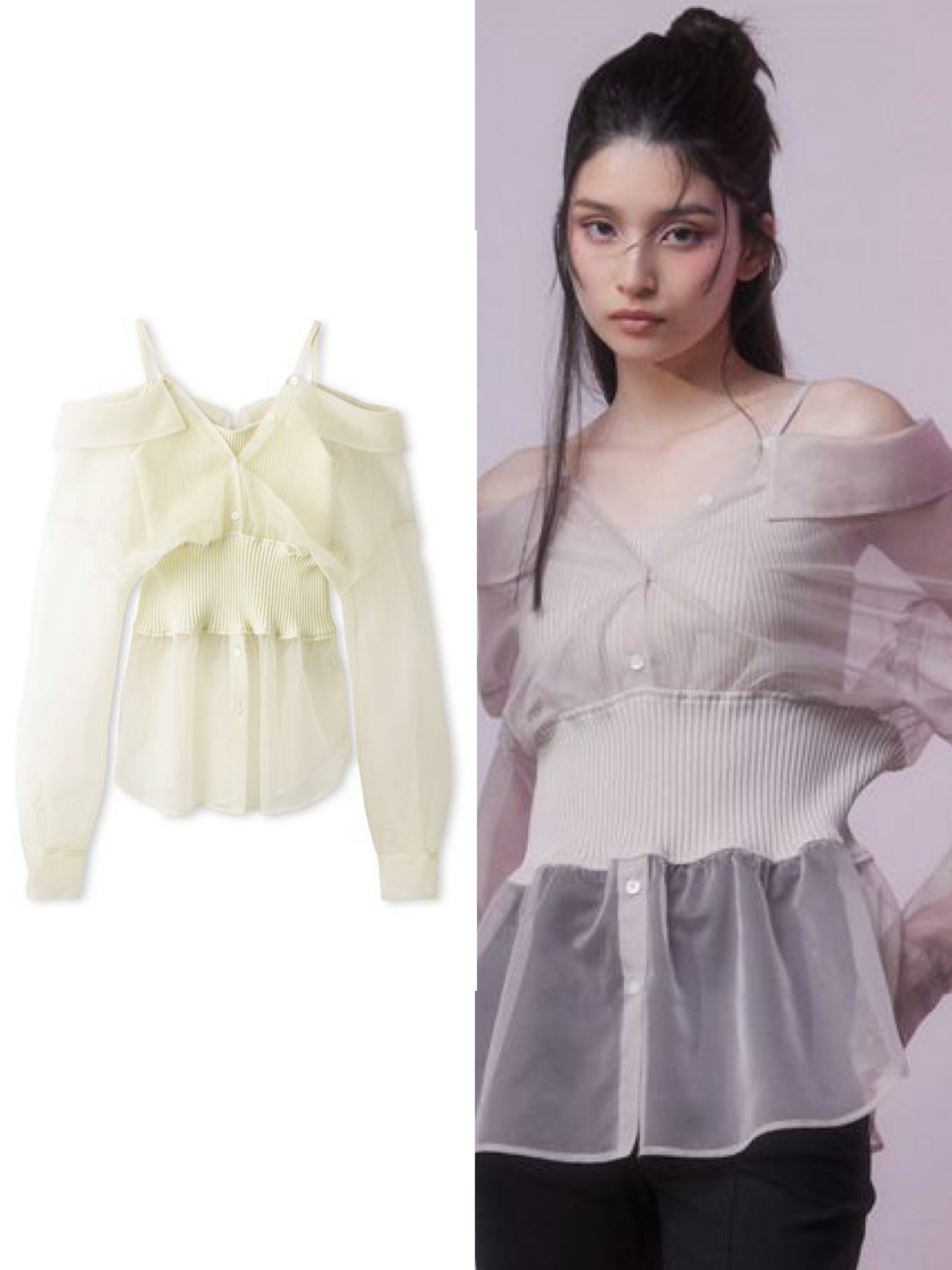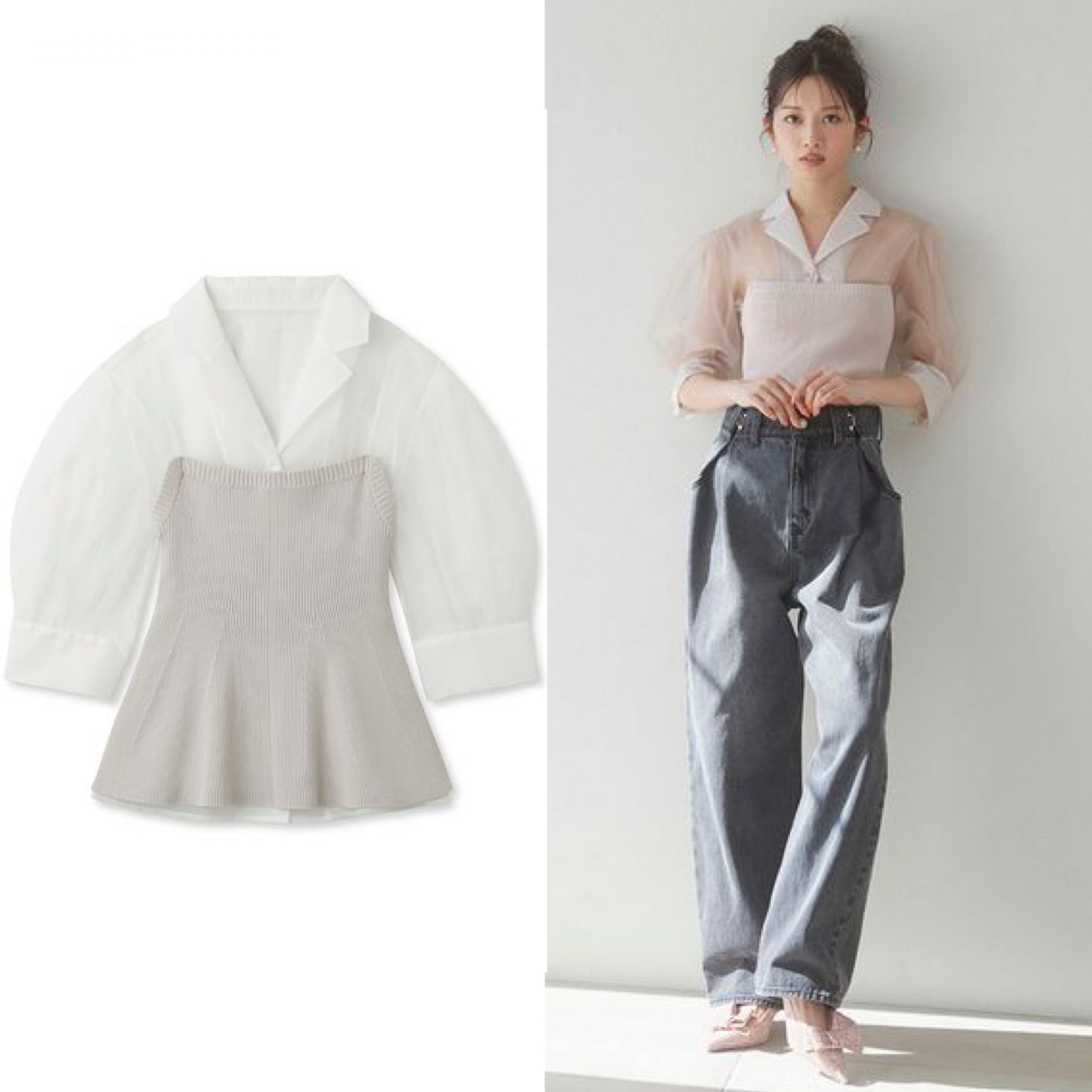 こちらはシアー素材の開襟シャツとビスチェがセットになったアイテム。配色もバランスよく考えられているから、頼もしい。シャツはオーガンジー素材で、ふっくらとした袖も愛らしいポイントに。ニットビスチェブラウス/スナイデル