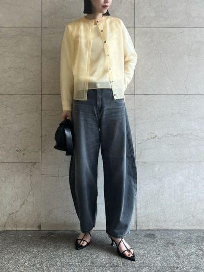 立体感な旬なシルエットのデニムは真っ先に手に入れたい。ワイドシルエットながらも、柔らかな風合いの生地が重たくならずに、自然とヒップラインや脚のラインをカバーしてくれます。コンパクトなトップスを合わせて、デニムを主役にするスタイリングがおすすめ。