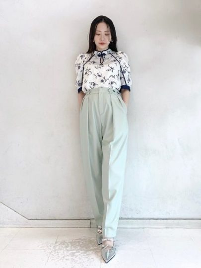 両サイドのボタンがポイントのテーパードパンツ。トレンドライクな程よいカーヴィーシルエットで、ラフな抜け感を演出。ウエストはゴム仕様だからフィット感があってラクちん。シワになりにくい素材で、お仕事シーンでも活躍しそう。