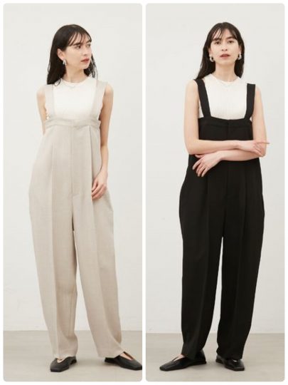 オールインワンにもカーヴィーなシルエットが登場。腰回りに膨らみをもたせたコクーンシルエットは、締め付けなずに、テーパードでスッキリ見えも叶います。太めの肩紐と前に入ったタックデザインが、コクーンでも甘くなくマニッシュな印象に。ドライタッチでほどよい薄さのスーツ生地で夏も快適!