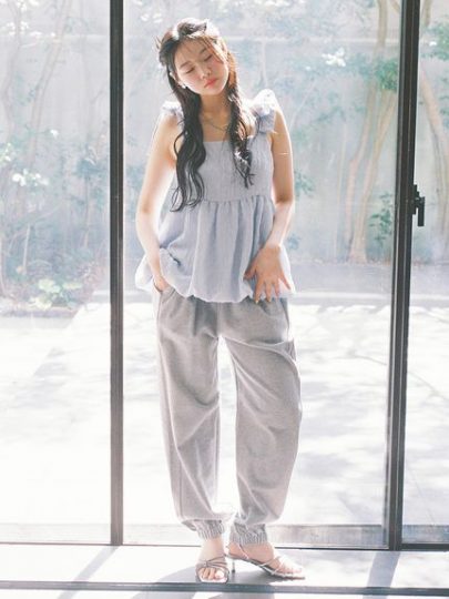 夏でも涼しいミニ裏毛のスウェットパンツ。素材の落ち感を活かしてカーブを描く柔らかな曲線が女性らしく、足元にくしゅっとたまる生地がニュアンスを演出。