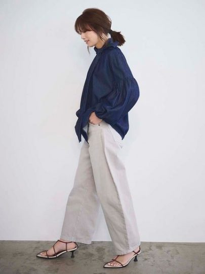 立体感な旬なシルエットのデニムは真っ先に手に入れたい。ワイドシルエットながらも、柔らかな風合いの生地が重たくならずに、自然とヒップラインや脚のラインをカバーしてくれます。コンパクトなトップスを合わせて、デニムを主役にするスタイリングがおすすめ。