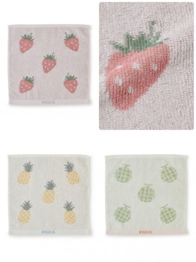吸水機能に優れた柔らかいモコ素材。フルーツの柄は刺繍で再現されています。