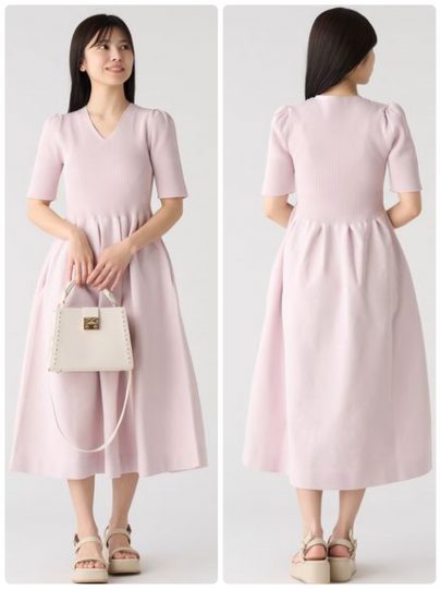 軽くてシルエットが綺麗に出る糸を使用したニットワンピ。上身頃はリブ仕立てで身体にキレイに沿いながらもラインを拾いすぎず、ウエスト位置からタックを入れたフレアシルエットでメリハリのあるシルエットに。ひじ上の長めの半袖、華奢なVネックが上品な印象で、夏のおでかけにぴったりです。