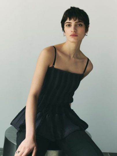 ベロア調とマットのふたつの質感でストライプ柄を表現し、メリハリの効いたペプラムシルエットも手伝って、どこかモードな雰囲気に。構築的なフォルムには、気になるヒップ周りをカバーする効果も。アジャスター付きのストラップは取り外し可能。さらにインナーに悩まずに着用できる便利なカップイン仕様。一枚でサラッと着るだけで、サマームードが高まります。