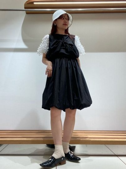 バルーンのオフショルワンピースにカットソーをレイヤードすれば、二の腕をオシャレにカバーできます。