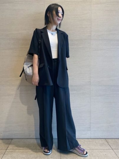 軽い素材で着心地の良いセットアップ。きちんと感のあるジャケットコーデは、ラフな小物で脱力するのがあか抜けの秘訣。