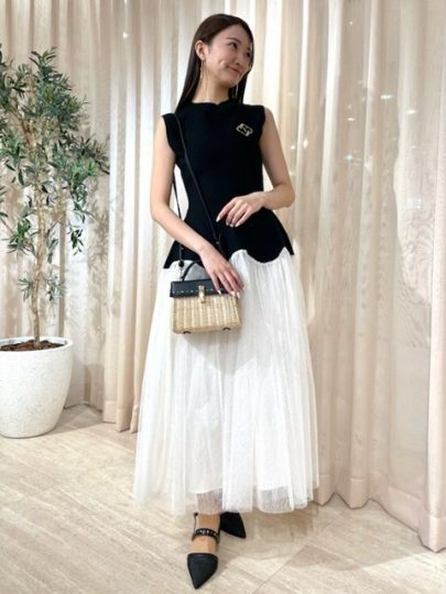 チュールレースをたっぷりと使用した華やかなワンピースが主役。動くたびにふわっと軽やかに揺れるスカートは夏にぴったり。