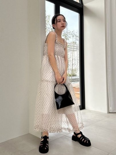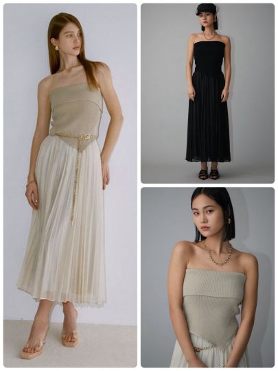 昨年大人気を博したワンピースがアップデートして再登場しました。メッシュトップスにベアトップスをインしたようなデザインのドッキングワンピで、涼しげかつヘルシーな色気を振りまきます♡スタイルアップ効果のあるIラインシルエットもポイント。
