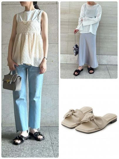 アッパー全体をリボンで仕上げたデザインがキュート。抜け感満載なフラットサンダルだから甘すぎず、バランスよく履きこなせます。リボンモチーフを足先に施しいるため、パンツをはいても隠れません。