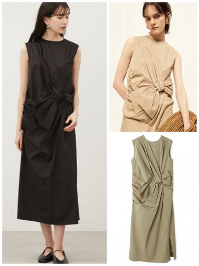 リボンの結び目で流れるようなドレープを表現。すとんと落ちるストレートなフォルムと落ち着いたカラーが大人っぽい。