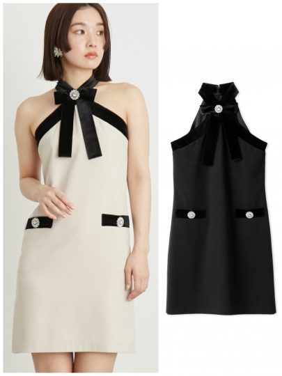 ホルターネックのクロス部分にリボンと大粒ビジューをあしらってドレッシーに。ベロア素材のリボンで品よく見せて。