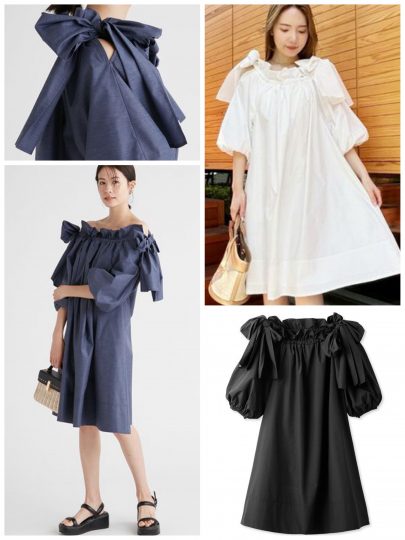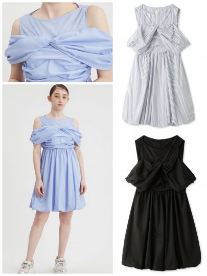 胸元で大きなリボンを結いたような変化球デザイン。裾のバルーンなど全体的に丸みを帯びた形で遊び心をしのばせて。