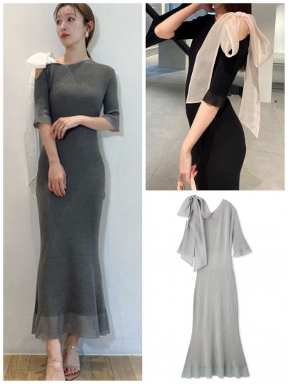 女っぽいシルエットが際立つニットワンピ。肩を大胆に覗かせたアシメデザインに、オーガンジーのリボンで儚げな甘さをトッピング。