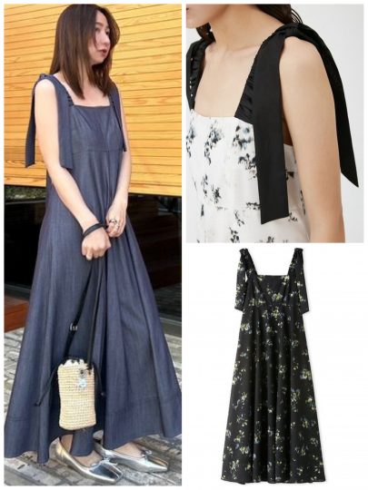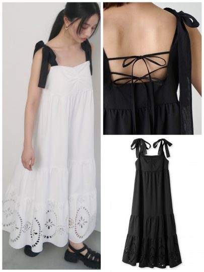 太めストラップが軽やかなキャミワンピを引き締めてくれる。カラーによってリボンの配色が異なるのもこだわり。