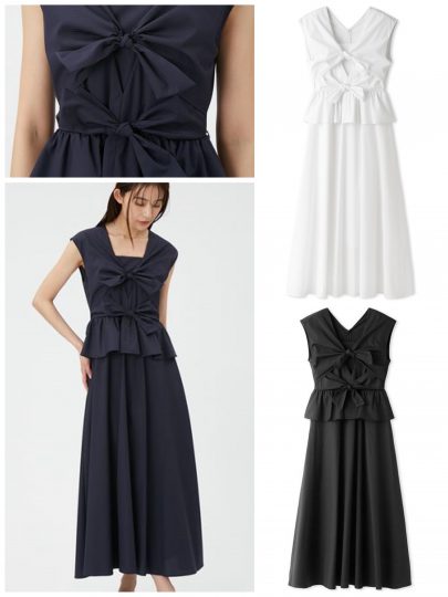 立体感ある結び目で作る、甘くなりすぎない大人のためのリボンモチーフ。ペプラムでさらにメリハリあるシルエットをメイク。